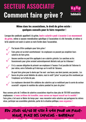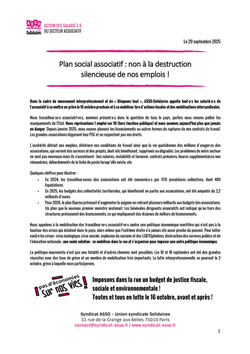 Dans ce contexte, le syndicat ASSO-Solidaires (constitué de salarié·es d'associations) a déposé un préavis de grève pour la journée du 16 octobre. Tout·e salarié·e d'association est en donc en droit de se mettre en grève ce jour -là.