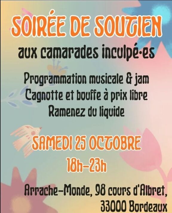 Le collectif Nuées organise une soirée de 18h à 23h au bar associatif l'Arrache-Monde, pour récolter des fonds pour aider les camarades réprimé.e.s qui en ont besoin : programmation musicale (concert d'un super goupe et dj sets !) et jam, bouffe à prix libre !