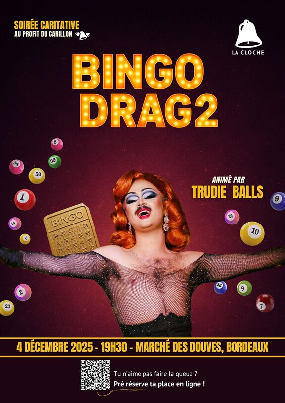Rejoignez-nous pour une soirée inoubliable, placée sous le signe du glamour, de la solidarité et du fun ! Trudie Ball, Drag Queen extraordinaire, animera le bingo avec humour et éclat, avant de vous offrir un show drag spectaculaire qui illuminera la soirée. Tous les fonds récoltés seront reversés au programme Carillon, pour soutenir les personnes en situation de précarité. Rendez-vous pour une ambiance festive et solidaire, des performances éblouissantes, et des lots à gagner ! Venez nombreux !