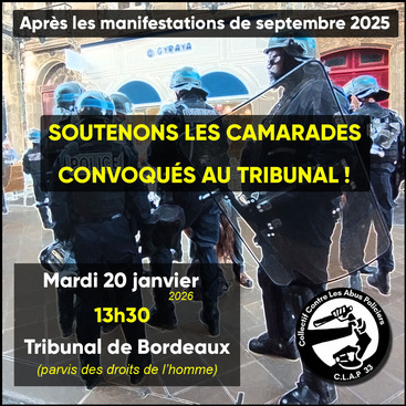 🥵 Les manifestations de septembre 2025 ont connu leur lots de répression, entrainant pour des camarades arrestations plus ou moins brutales, gardes à vue souvent humiliantes, contrôles judiciaires en attendant leur procès.