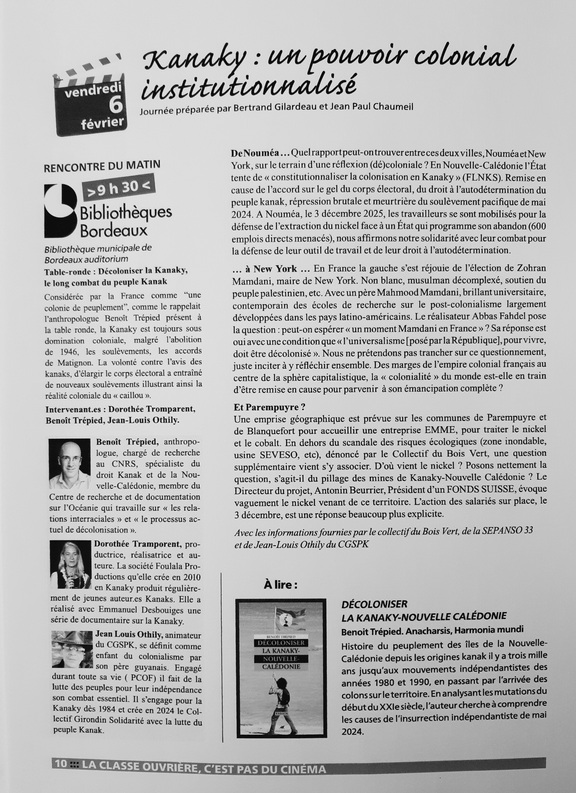 Dans le cadre de la 22ème édition des Rencontres cinématographiques " La classe ouvrière c'est pas du cinéma", la Kanaky Nouvelle-Calédonie est à l'honneur ! A l'heure du déchainement de l'impérialisme étasunien tous azimuths, le colonialisme français n'est pas en reste avec l'accord "Elysée-Oudinot" qui ne fait pas l'unanimité, y compris parmi ceux qui l'ont pourtant signé. Où en sommes-nous aujourd'hui ? L'accord "Elysée-Oudinot" met de côté le processus onusien d'accompagnement vers l'indépendance et C'EST TOUT LE CONTRAIRE qui arrive : un recul du processus onusien qui traçait un chemin au peuple kanak vers son indépendance !