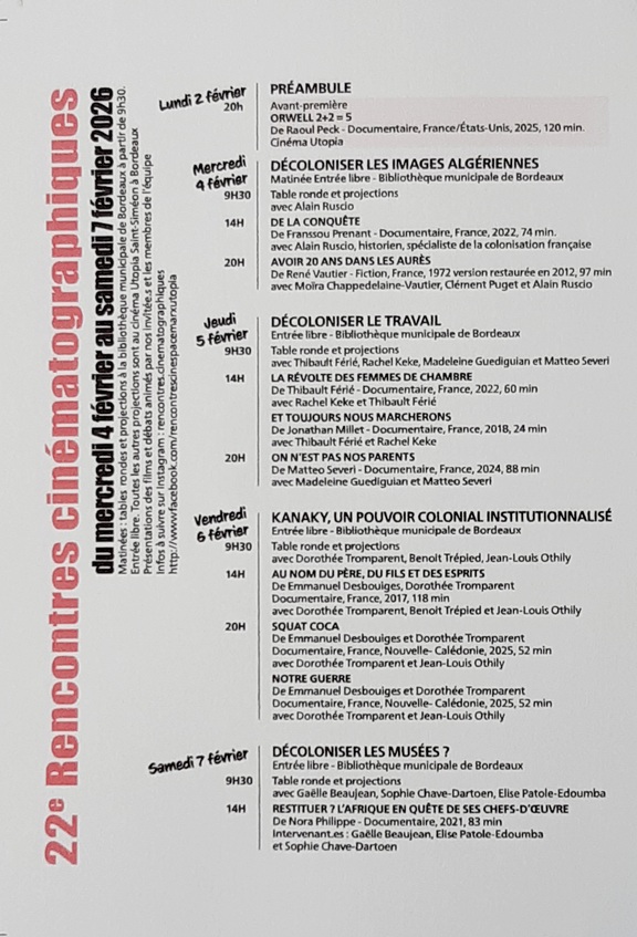 L'Utopia accueillera ce la co-réalisatrice Dorthée Tromparent de deux films documentaires sur la réalité quotidienne en Kanaky Nouvelle-Calédonie et d'un autre sur la perspective historique de la Kanaky en route (?) vers son indépendance. Sera à ses côtés Benoît Trépied, anthropologue spécialiste reconnu de l'archipel calédonien et auteur de l'essai "Décoloniser la Kanaky Nouvelle-Calédonie" qu'il dédicacera toute la journée. Tous les deux animeront le débat qui fera suite aux films, avec le concours du CGSPK (Collectif girondin de solidarité avec la lutte du peuple kanak).