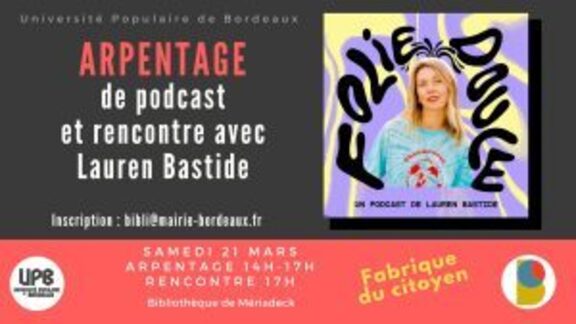 Rendez-vous le samedi 21 mars à 14h, à la bibliothèque de Mériadeck, on arpentera le podcast "Folie douce" de Lauren Bastide, dans le cadre du festival La Fabrique du citoyen : https://bibliotheque.bordeaux.fr/agenda/les-e…