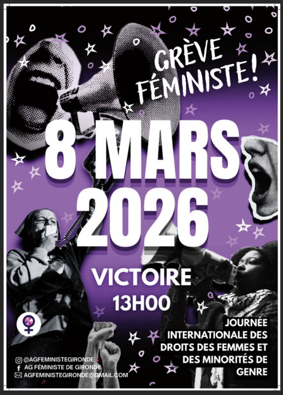 Le 8 mars, Journée internationale de lutte pour les droits des femmes et des minorités de genre, nous appelons à une grève féministe massive : grève du travail, des tâches domestiques et reproductives. Pour faire entendre nos voix, soyons nombreux·ses aux manifestations et aux différentes actions organisées partout en Gironde ! Plus précaires, plus exposé·es aux violences !